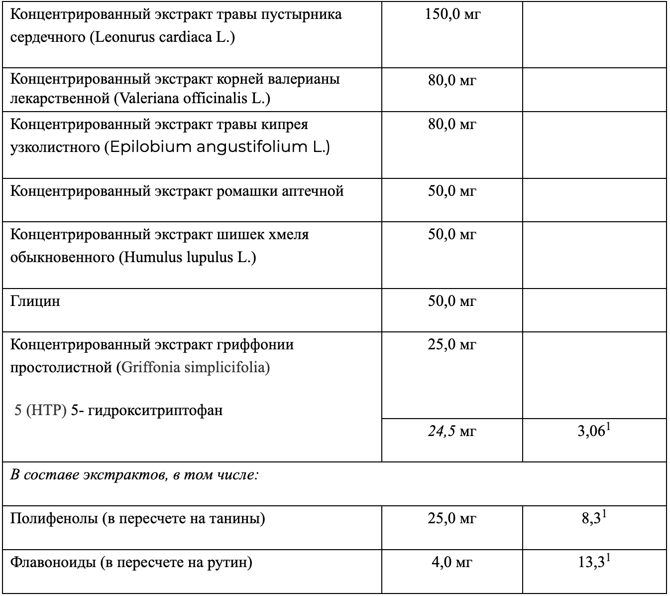 Состав №2 – вечер: экстракты концентрированные сухие: травы пустырника сердечного, корней валерианы лекарственной, травы кипрея узколистного, глицин, экстракты концентрированные сухие травы ромашки аптечной, шишек хмеля обыкновенного, гриффонии простолистной, стеарат кальция, растительная мука (рисовая мука из длиннозерного белого риса).