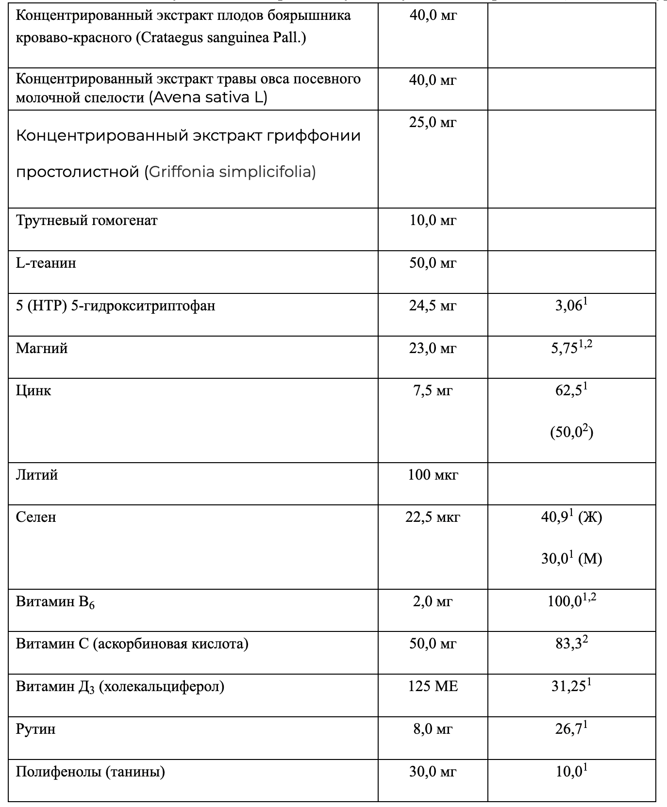 Состав №1 – день: магния цитрат, L-теанин, аскорбиновая кислота (витамин С), экстракты концентрированные сухие: плодов боярышника кроваво-красного, травы овса посевного молочной спелости, растительная мука (рисовая мука из длиннозерного белого риса), экстракт концентрированный сухой гриффонии простолистной, цинка цитрат, рутин, трутневое молочко (гомогенат), стеарат кальция, витамин В6, литий цитрат, витамин Д3, селенит натрия.